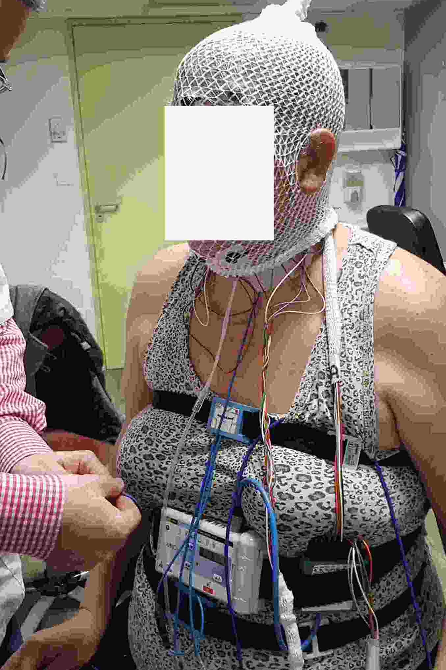 - La polysomnographie : en plus des précédents capteurs est ajouté un enregistrement EEG (électrodes sur la tête) pour analyser les stades de sommeil . Cet examen est réalisé en ambulatoire (appareil est posé dans notre centre et le patient retourne dormir chez lui dans son cadre de vie habituel) ou en hospitalisation à la clinique.